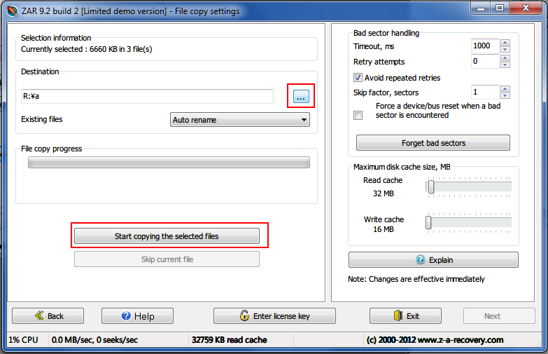 次に,下の赤枠(Start copying the selected files)をクリック.復旧が始まります.