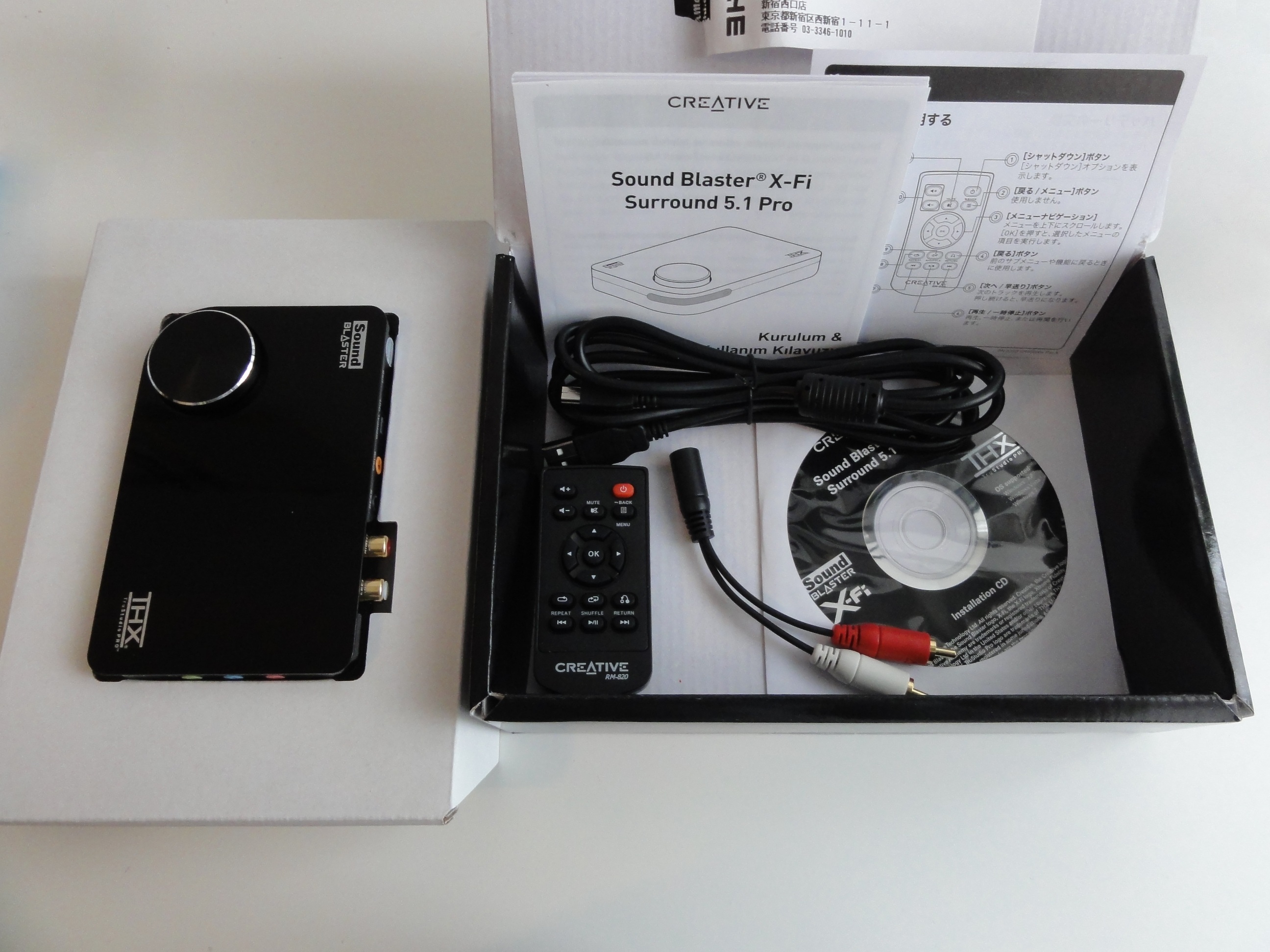 箱のなかには、 SB-XFI-SR51P本体、USBケーブル(ミニ)、リモコン(CR2025)、ドライバーなどのCDと説明書が入っていました。