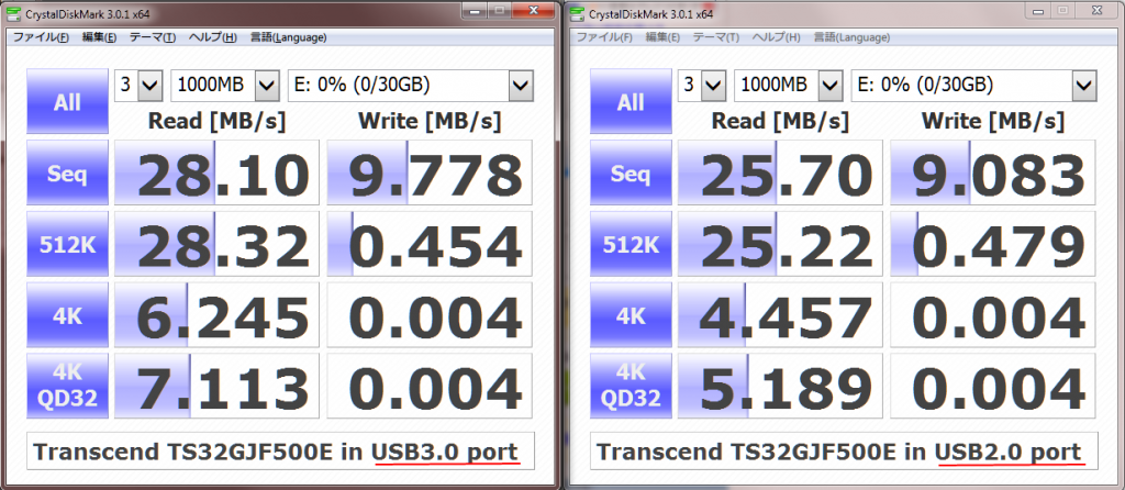 あと,USB2.0ポートと,USB3.0ポートで速度が変わるのかもテストしてみました.